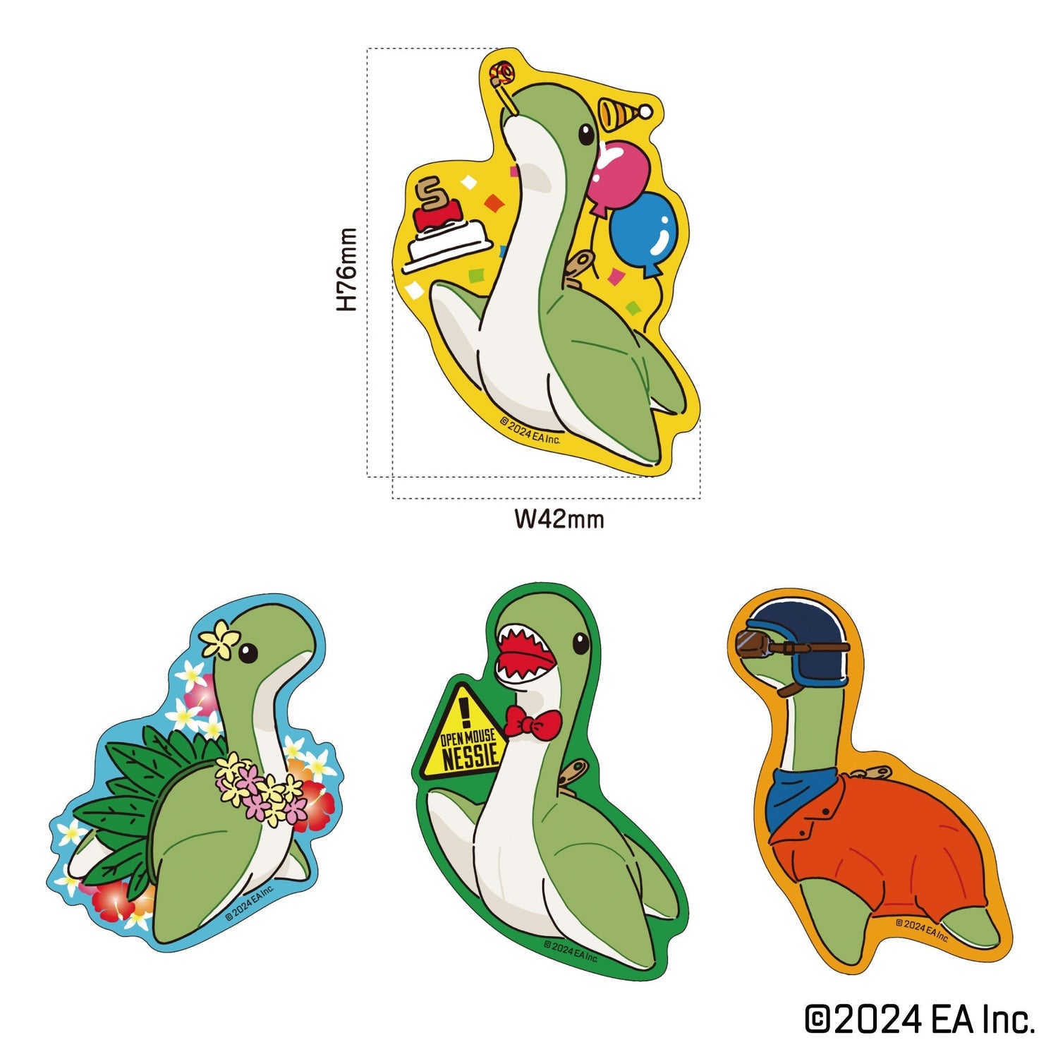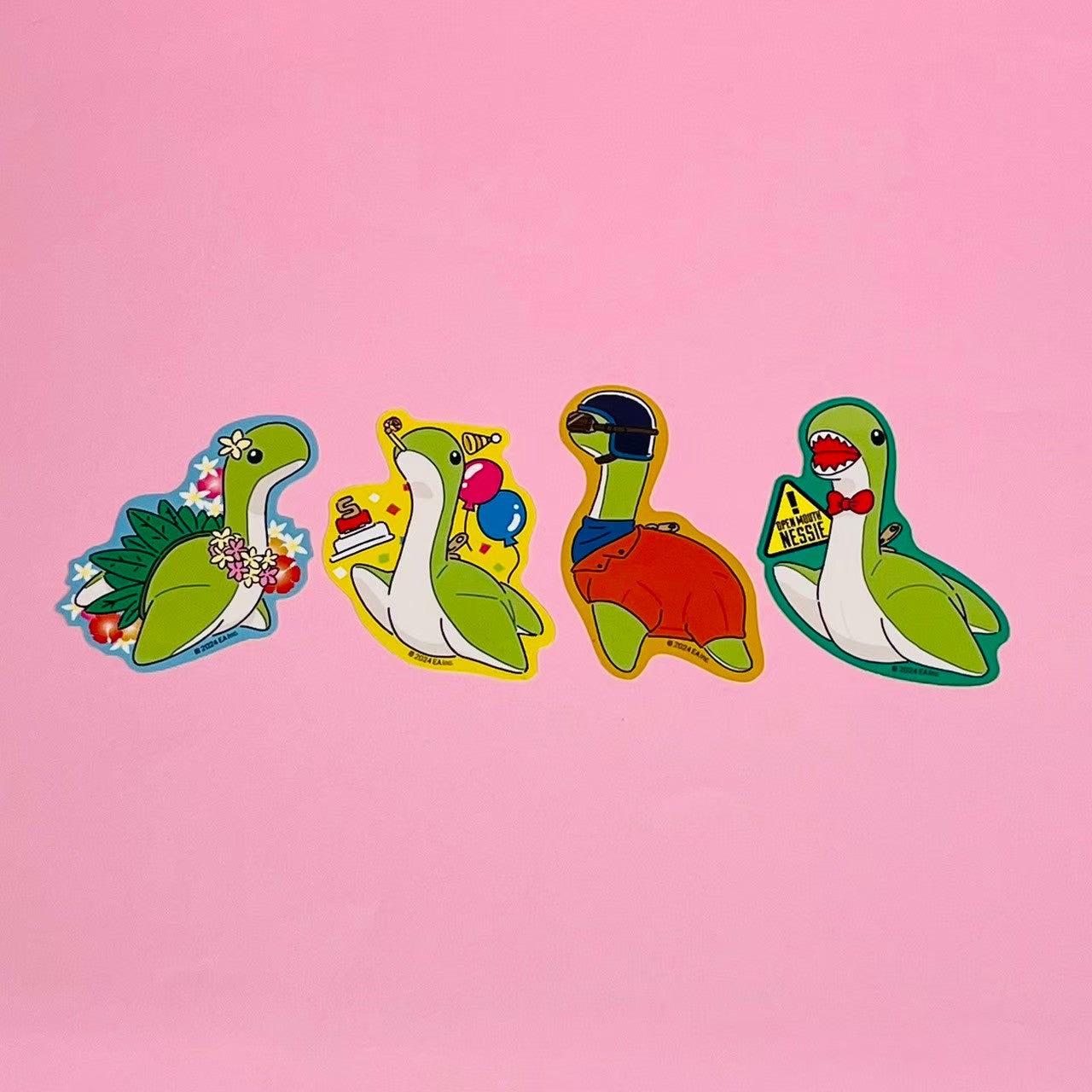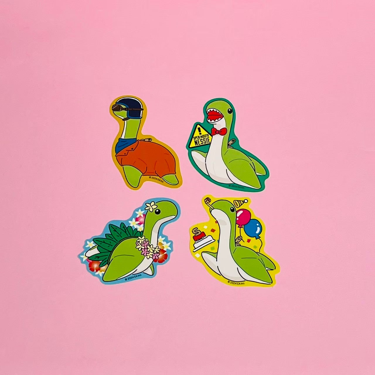 様々な服装をした人気キャラクターネッシーのダイカットステッカーが4枚入っています。