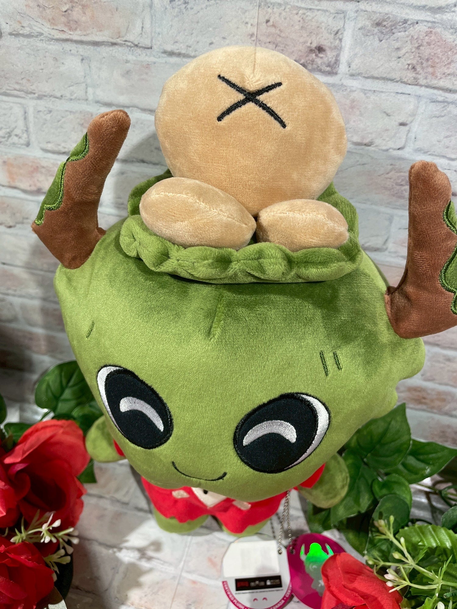 キュートなフェイスがとっても可愛いアムドゥシアスのぬいぐるみは、頭から伸びる2本の尖った角が、頭頂部の茶色い卵を囲んでいます。
