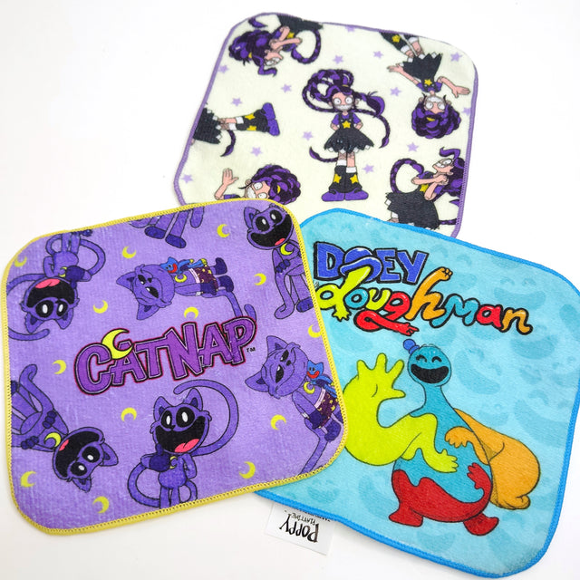 人気キャラクター「キャットナップ」と新しい仲間たちが描かれた、使い勝手の良い3枚セットのミニタオルです。